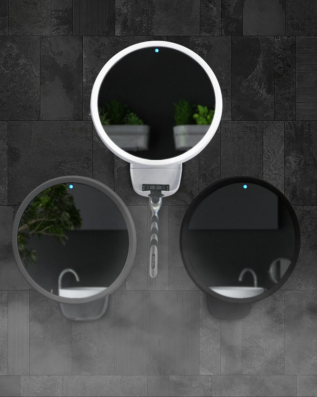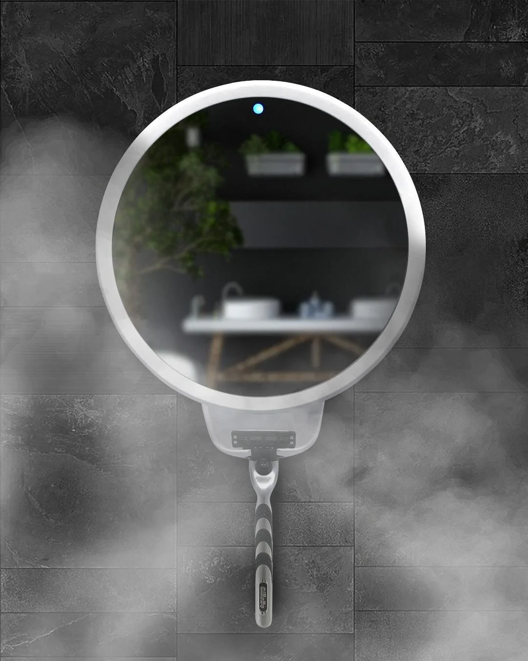 This Electrically heated shaving mirror provides a fog free shave when in the shower. The mirror has a built-in lithium battery that provides enough power for a weeks worth of shaving. It securely attaches to the wall via a strong 3M VHB adhesive. The mirror also has a built in razor holder.
