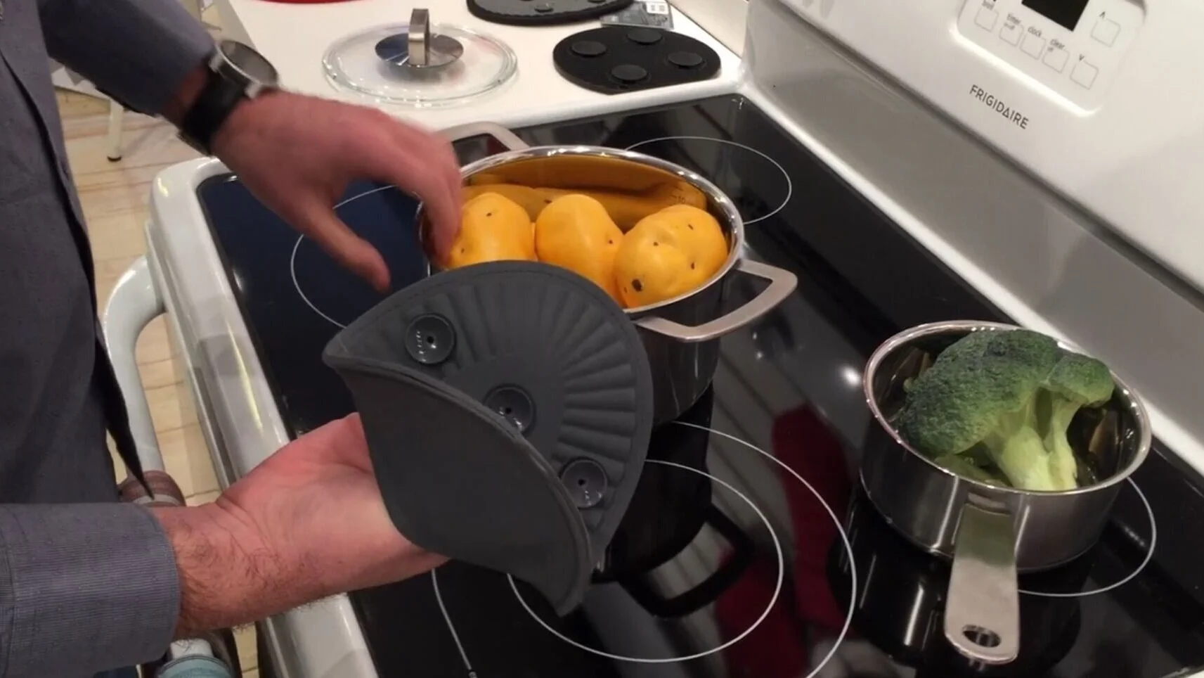 This product is a combination Trivet and Oven Mitt. When used as a Trivet it has suction cups that attach to the bottom or your pots or pans. It can also be folded in half and used as an oven mitt. It uses a patented intermittent suction cup technology that activates the suction cups when used as a trivet and deactivates them when used as an oven mitt.